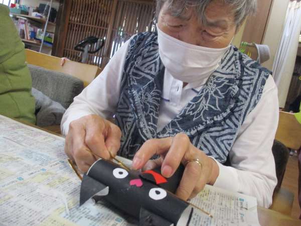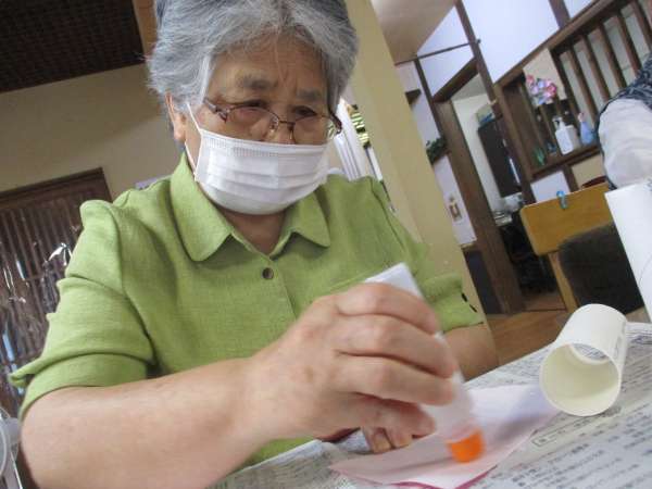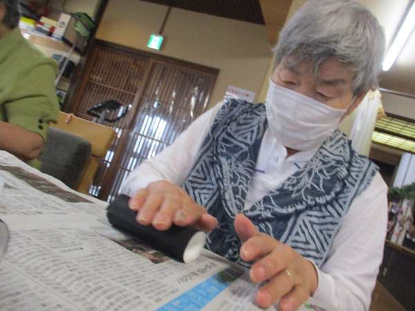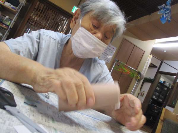 トイレットペーパー芯にコロコロと貼り付ける作業