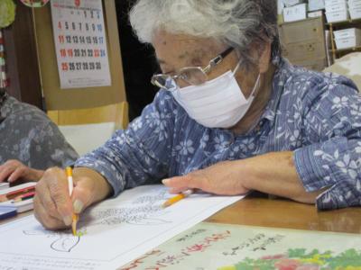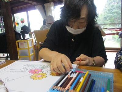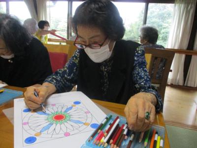それぞれ、数字塗り絵や曼陀羅塗り絵、季節の花々等の塗り絵に取り組まれています。
