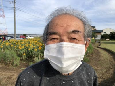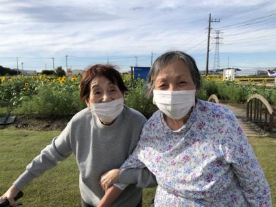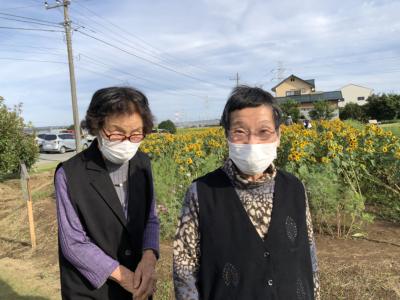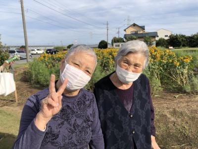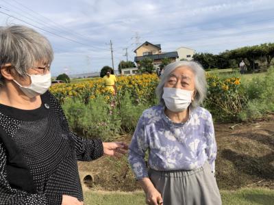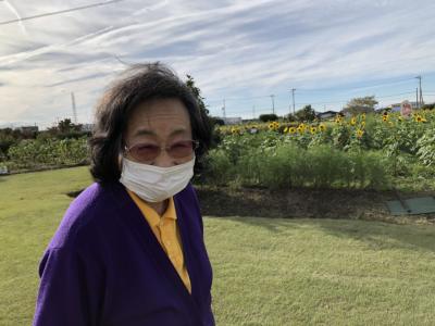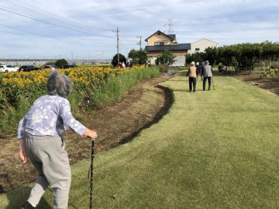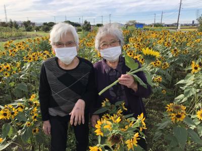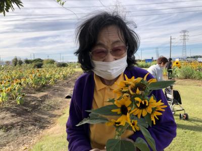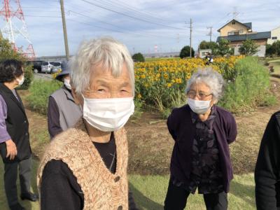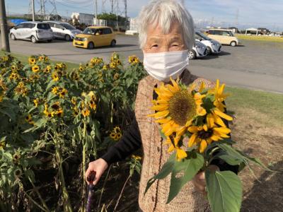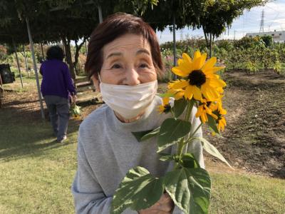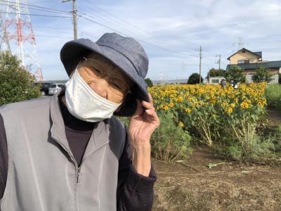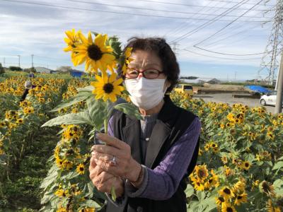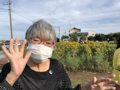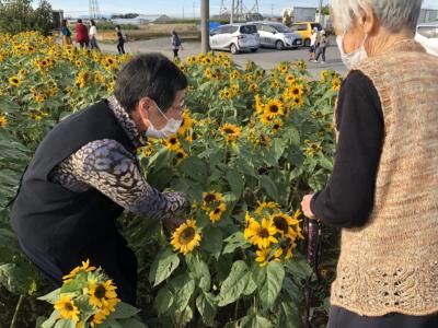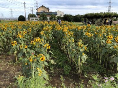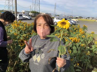 秋晴れの中、ヒマワリ畑とちょっと不思議な気分でしたが、