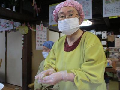 エプロンを着け、帽子を被り、手袋マスク・・・