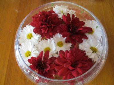 テーブルの上には丸い花器に入った花手水のように可愛らしいお花✨