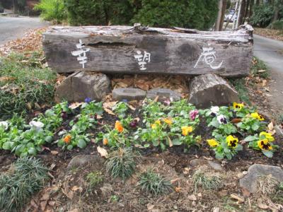新しく設置された看板よこにある紅葉が、わずかに顔をだしてくれたお日様に照らされ
