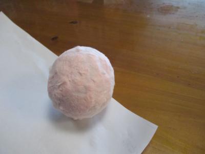 カプセルに和紙が包まれ、きれいなピンクの真ん丸が出来ました