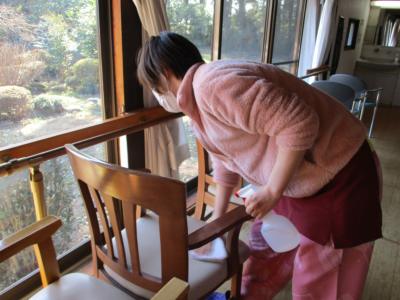 テーブルの他にも椅子や手すり等、定期的に消毒してい