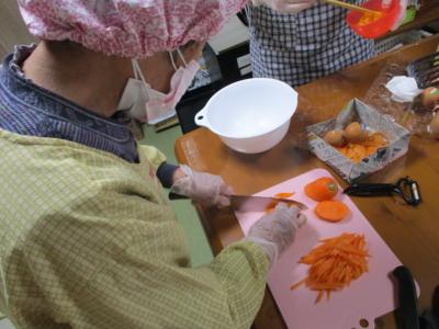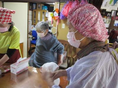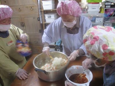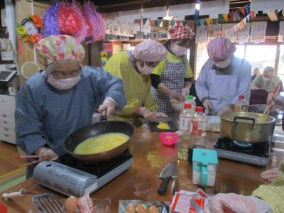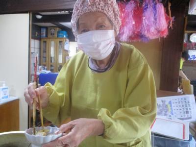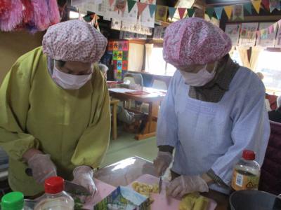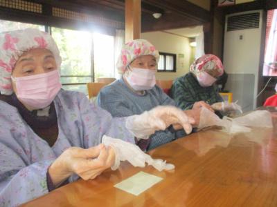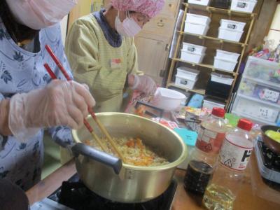 こちらの母たちは、絹さやや油揚げを切って下さっています