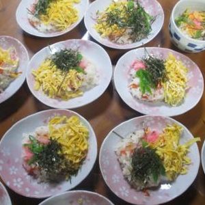 ちらし寿司と切り干し大根煮、厚揚げと水菜の煮びたし、お吸い物・・・