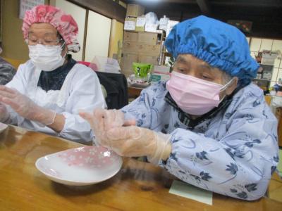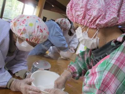 エプロン・頭巾を身に着け、消毒を行ったら手袋を付けて準備完了