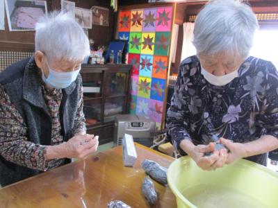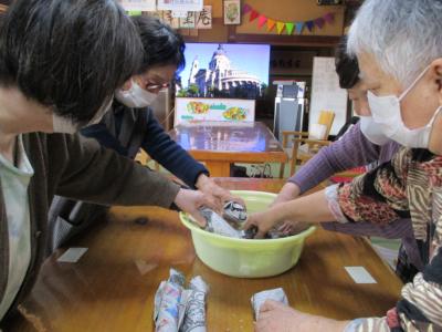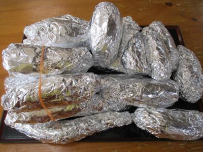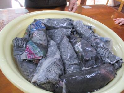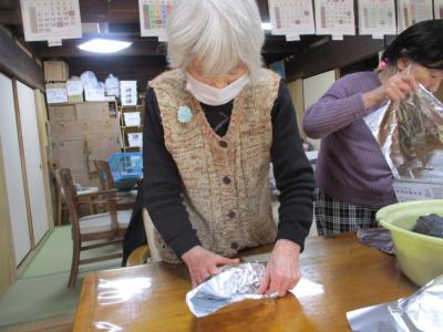 サツマイモを新聞紙で一つ一つ丁寧に包んで下さる母たち