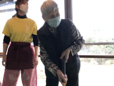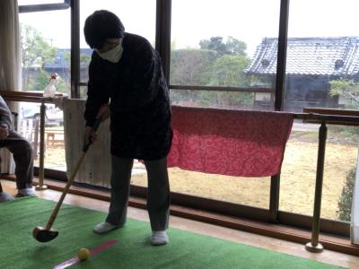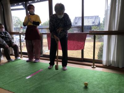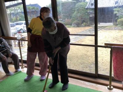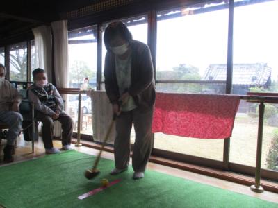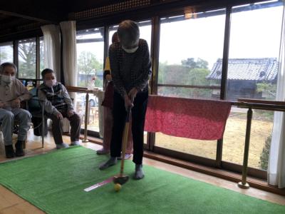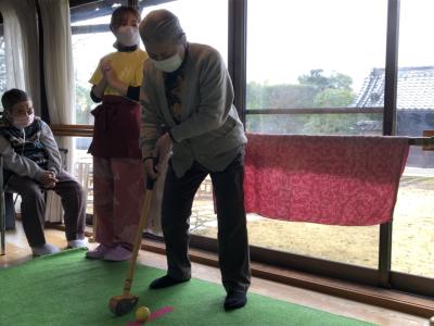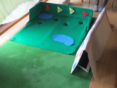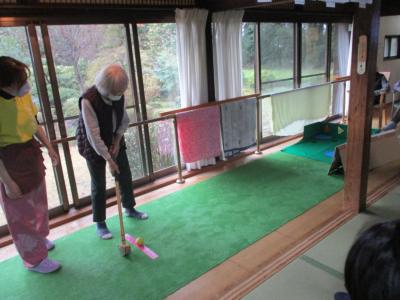 部屋の中は広いので縁側に芝をひいてパターゴルフ場が出来ました