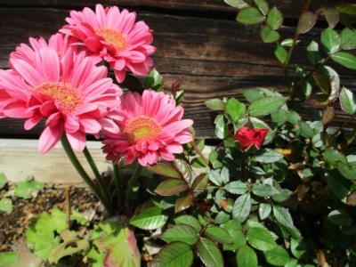 ガーベラのお隣ではバラも蕾を膨らませ、赤色の花が今にも咲き出しそう✨