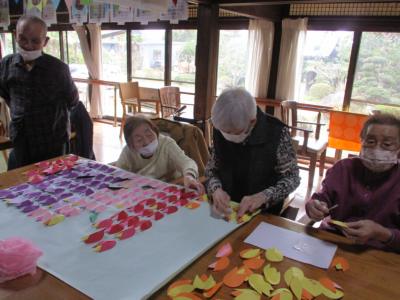 チューリップの花を手に、一つ一つ貼り付け作業の続きを行います✨