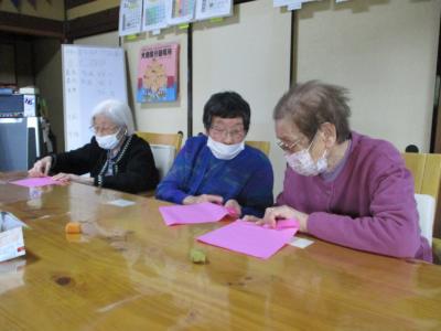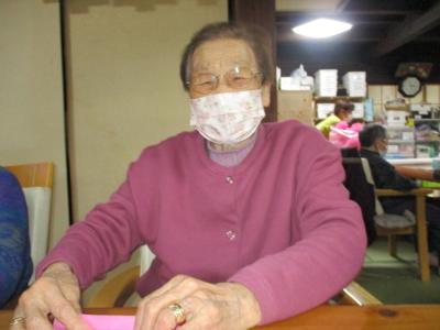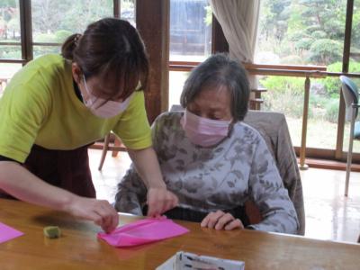 蛇腹折りのレクチャーを受けるお母さん・・・