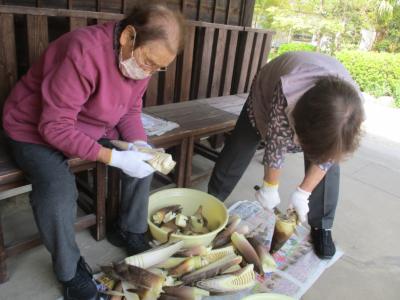 お昼休みの時間を使って、母たちと一緒にたけのこの皮むきをしました