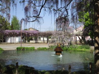 噴水を囲むように、綺麗に咲いた藤の花を楽しむ事が出来ます