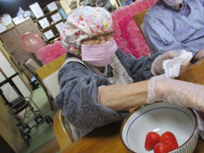 イチゴの水分を丁寧に拭きとっていきます