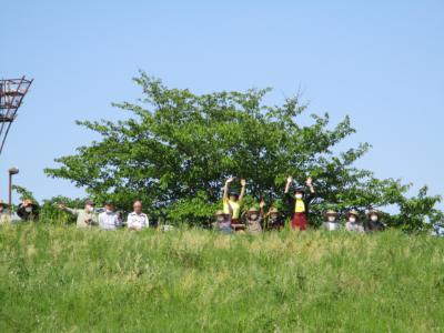 土手の下までポピーを見に行ったお父さん・お母さんに手を振る皆さん・・・