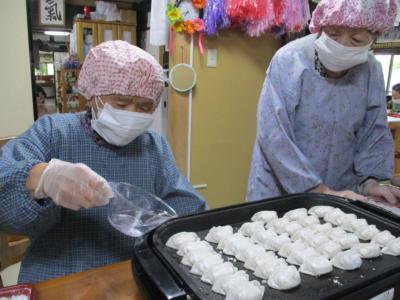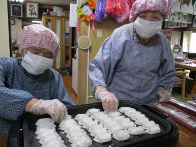 鉄板に餃子を並べて下さるお母さん達です・・・