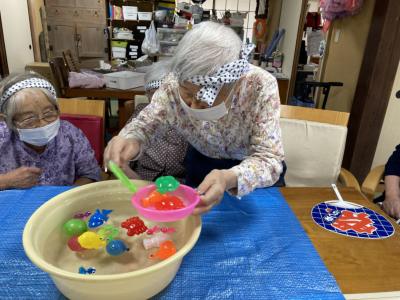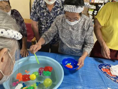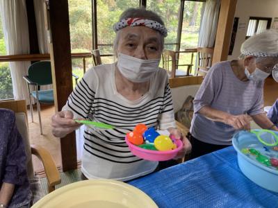 金魚すくいは水のはいった桶に色とりどりの金魚を釣って頂きました