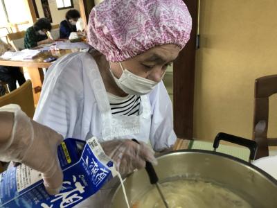 野菜や肉が煮込まれた大きな鍋に牛乳が投入されました✨