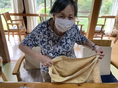 母達は家事動作の一環で洗濯物を畳んでくれています