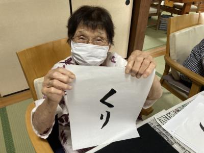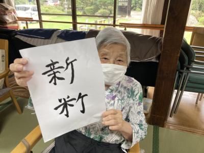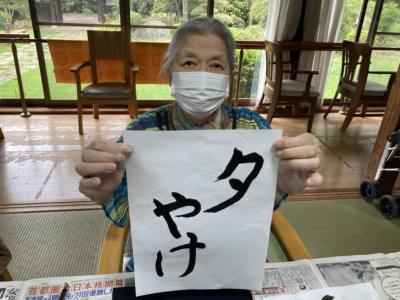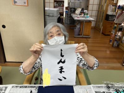 出来上がった作品を、皆さんお互いに褒め合いつつ書道に