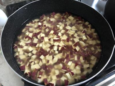 さつま芋を1cm角位に切って水を張ってアクを抜いて