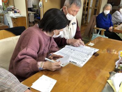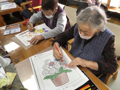 脳トレは季節の塗り絵や点つなぎ、買い物計算に取り組まれていますdouble exclamation