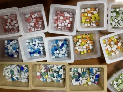 メインのタイルを張った後は、小さなガラスタイルを思い思いのセンスで