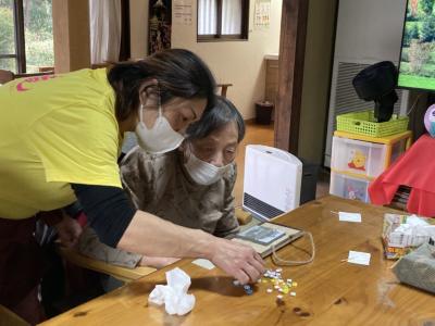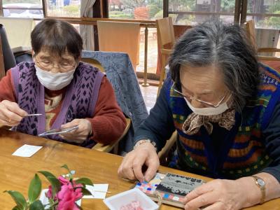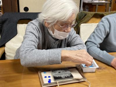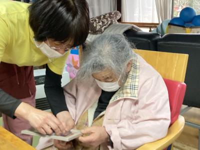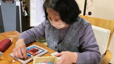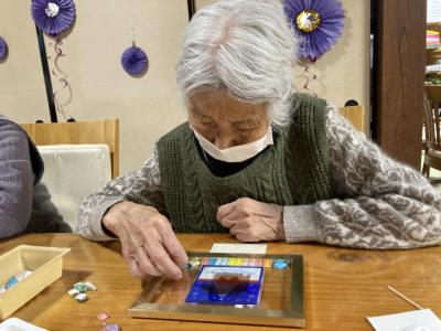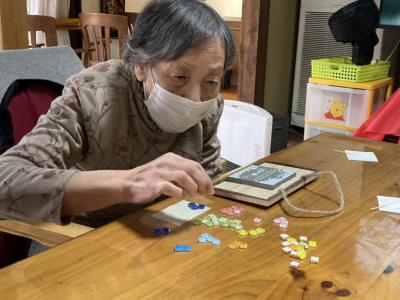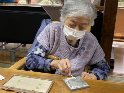 愛の幸望庵のレクリエーション初参加のお母さんも、手工芸に夢中です!
