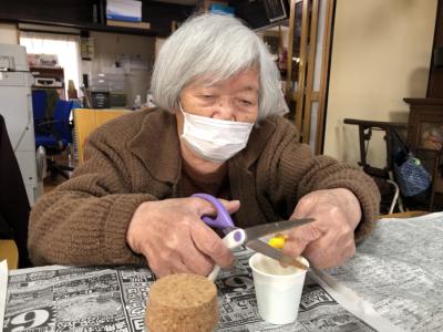 ご自分で選んだお色のクレヨンを紙コップの中に細かく刻んでいる皆さんです