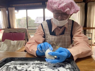 お餅が手にくっつかないように、しっかり粉を手に付けてからひらめき