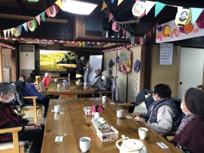 仲間と挨拶を交わし、お茶を飲みながら会話を弾ませる皆さんです
