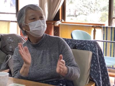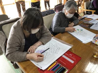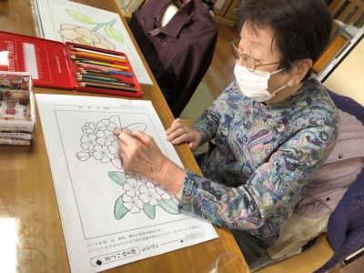 午前中は脳トレで塗り絵に取り組まれ、季節の花を好きな色で塗っていきますアート