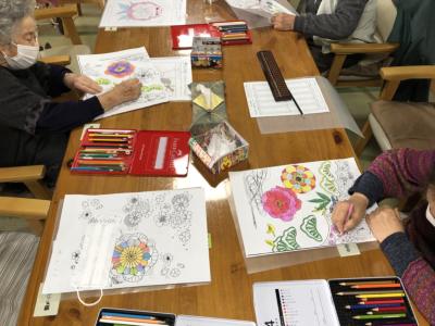 脳トレタイムでは、塗り絵や算盤、