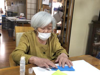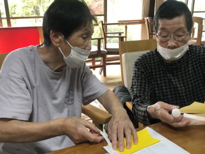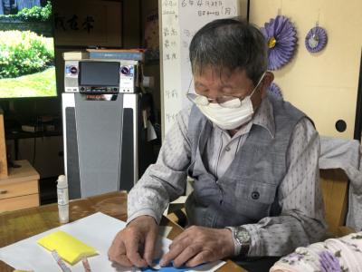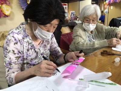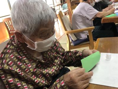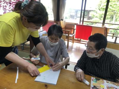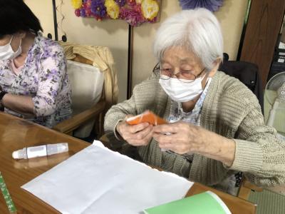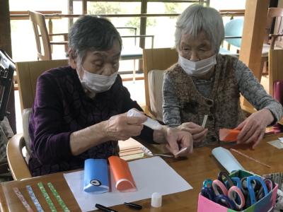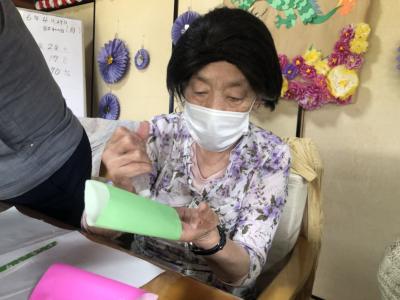 色柄の入った折り紙の帯を鯉のぼりに貼っていきます