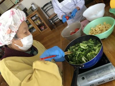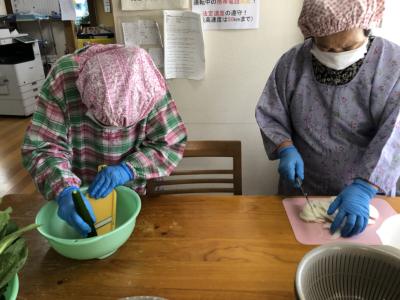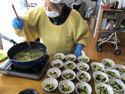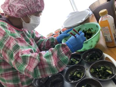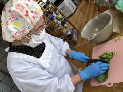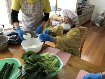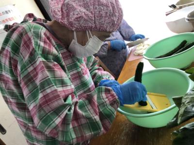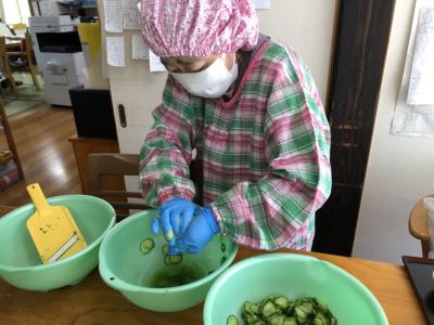 塩もみしたキュウリを慣れた手つきでギューと絞ります
