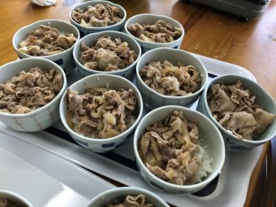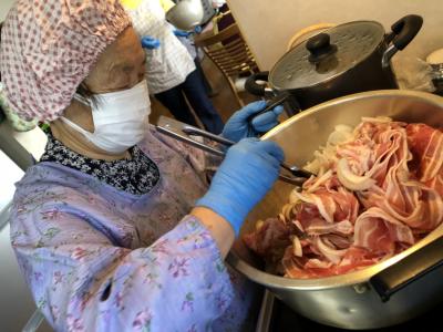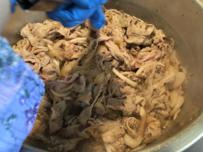 大きな鍋に玉ねぎと豚肉がたっぷり入ります