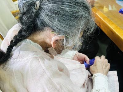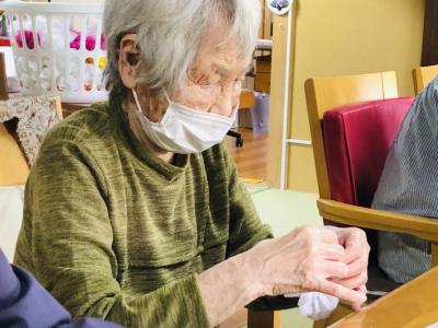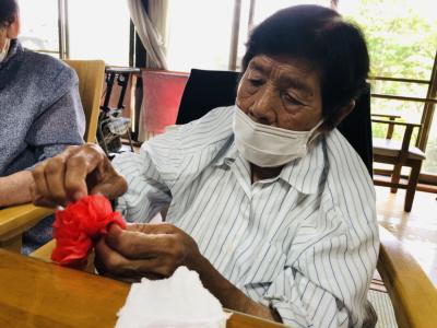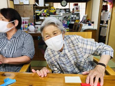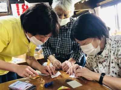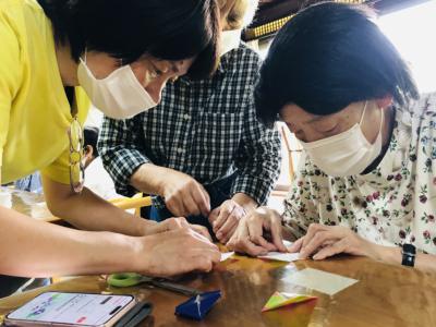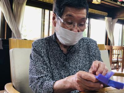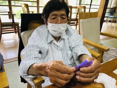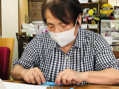 小さな折り紙を丁寧に丁寧に折り進める母