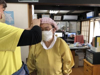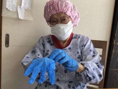 エプロン キャップ。手袋を着けて調理の身支度を整えます!