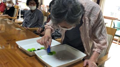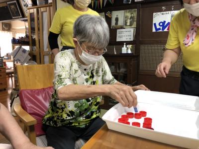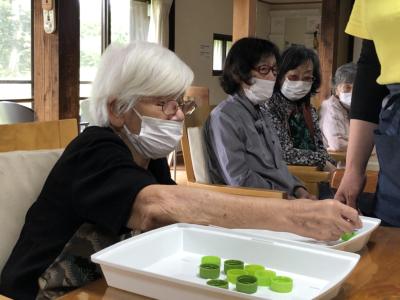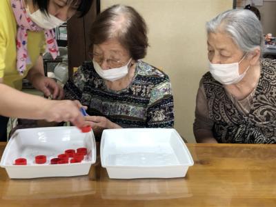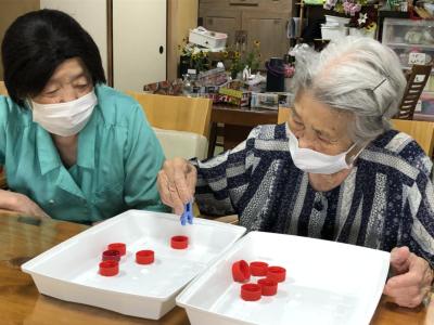 洗濯ばさみを広げ、キャップをつまみ手先の運動にも良いですね~~