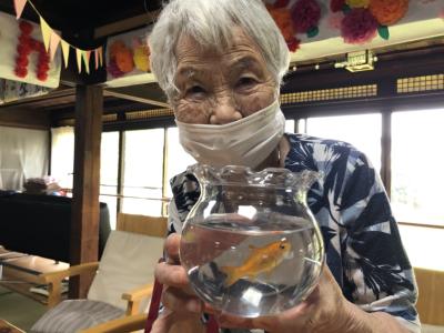 金魚を見て「ご飯食べてるの?元気だよね!」と話されている母たちハートたち (複数ハート)