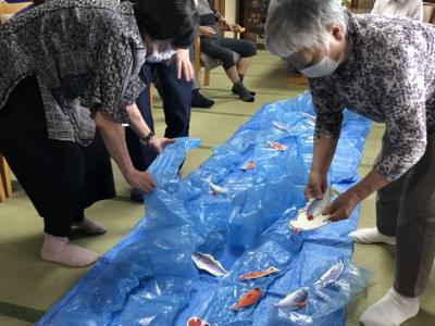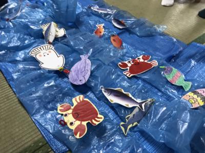川に見立てたブルーシートの上に手作りのお魚さん達を放流します