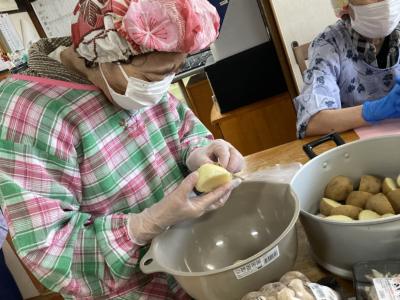 こちらは蒸かしたじゃがいもの皮をむいています🥔