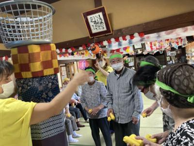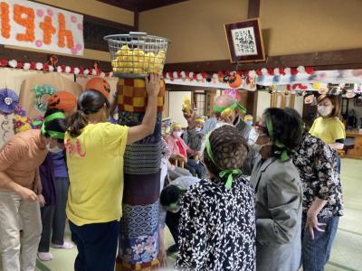 玉を持って、上ちゃんの持っているカゴへ向け投げていき