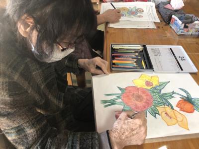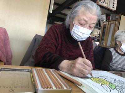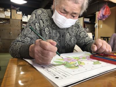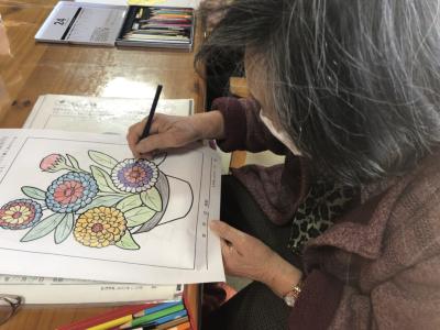 塗り絵をされる母にカメラを向けると