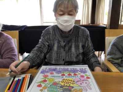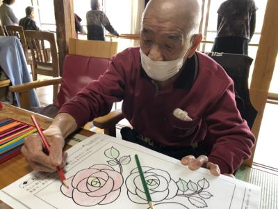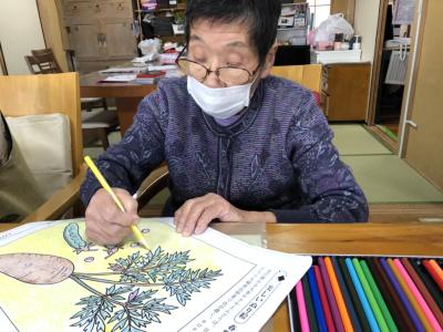 各々選んだ塗り絵を、どんな色に塗ろうか考えながら集中されて色塗りしています