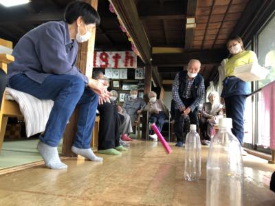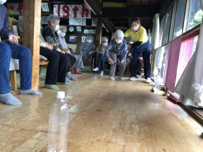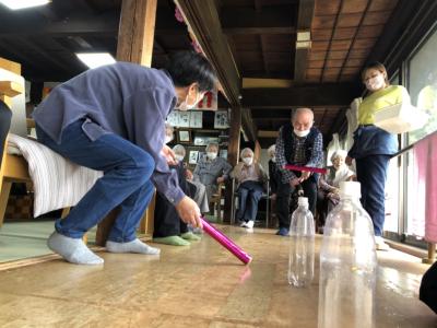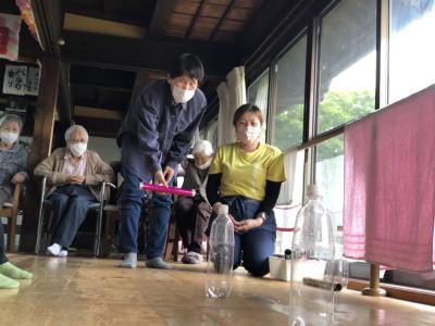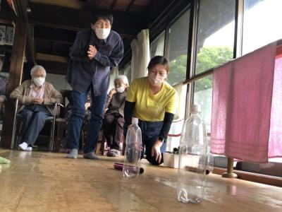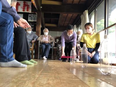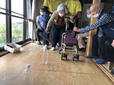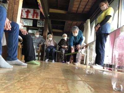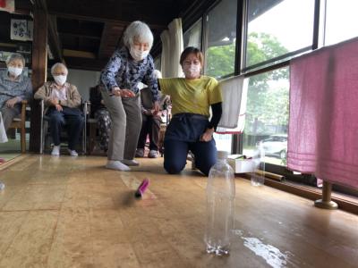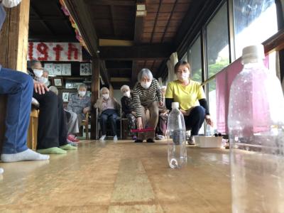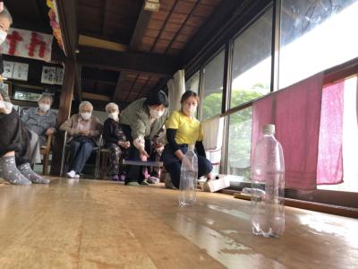 ペットボトルを手前から1本ずつ倒していくゲームです