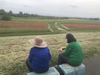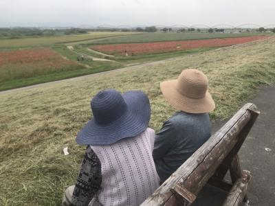 ベンチに座りポピー畑を見渡す皆さん✨✨