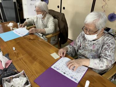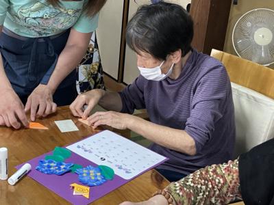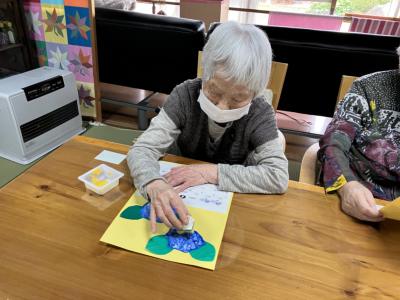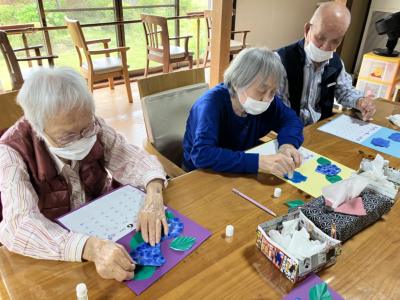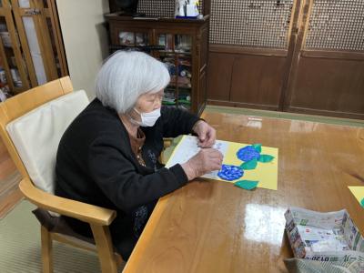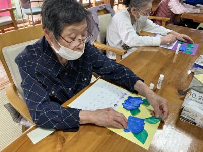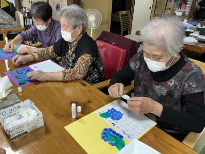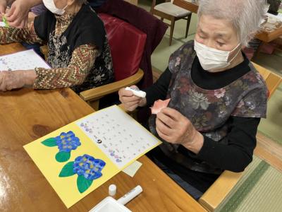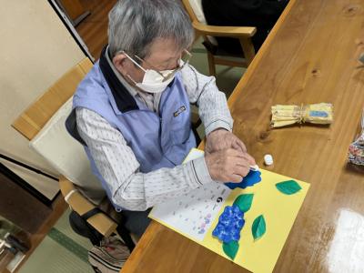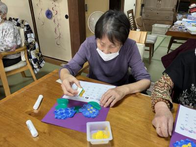 紫陽花と葉っぱのバランスを考えながら、糊で貼っていきますひらめき