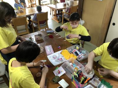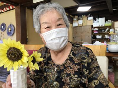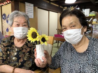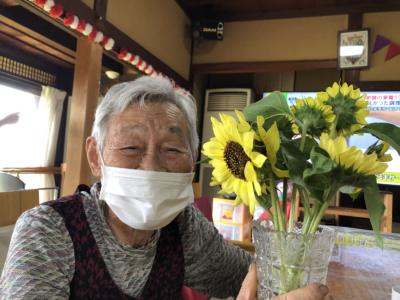 スタッフの自宅の庭で咲いたひまわりをテーブルに飾らせていただきました